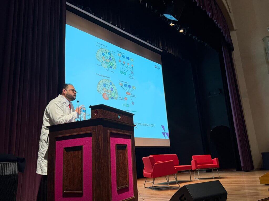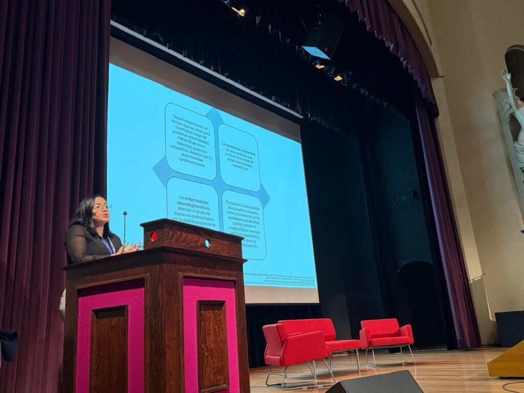 El programa académico incluyó conferencias impartidas por especialistas en distintas áreas de las neurociencias. El Dr. Fernando González abordó el Diagnóstico en la enfermedad de Parkinson, destacando los retos actuales en la identificación temprana de esta condición. Por su parte, la Dra. Lizbeth García presentó la conferencia El genoma en el cerebro envejecido: de la vulnerabilidad a nuevas rutas de intervención, en la que se exploraron los mecanismos que vinculan la estabilidad genómica con el envejecimiento cerebral. La Dra. Jazmín Samario expuso el tema Salud metabólica y neurodegeneración: resistencia a la insulina y enfermedad de Alzheimer, enfatizando la estrecha relación entre metabolismo y función neuronal. Finalmente, el Dr. Luis Jiménez ofreció la charla Semántica: la representación mental del pensamiento, aportando una perspectiva desde las ciencias cognitivas sobre cómo el cerebro organiza y procesa el significado.